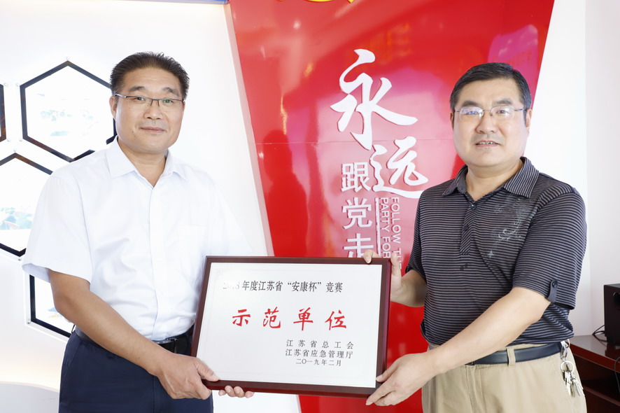 調(diào)研期間,陳健為集團(tuán)公司榮獲“2018年度江蘇省‘安康杯’競(jìng)賽示范單位”授牌,還為祝星星“勞模創(chuàng)新工作室”授牌。