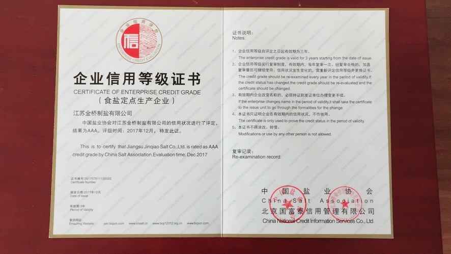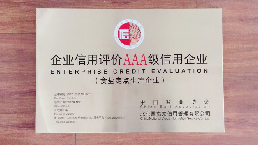 按照主營業(yè)務(wù)收入、利潤、主營業(yè)務(wù)收入利稅率及主營業(yè)務(wù)增速四項(xiàng)指標(biāo)評價(jià),2016年集團(tuán)公司被中國輕工業(yè)聯(lián)合會(huì)和中國鹽業(yè)協(xié)會(huì)評為中國輕工業(yè)制鹽行業(yè)十強(qiáng)企業(yè)。根據(jù)《社會(huì)信用體系建設(shè)規(guī)劃綱要(2014—2020)》,經(jīng)第三方專業(yè)評價(jià)機(jī)構(gòu)和中國鹽業(yè)企業(yè)信用等級評價(jià)委員會(huì)審核并向社會(huì)公示,2016年江蘇金橋制鹽有限公司被評為AAA級食鹽生產(chǎn)企業(yè)。