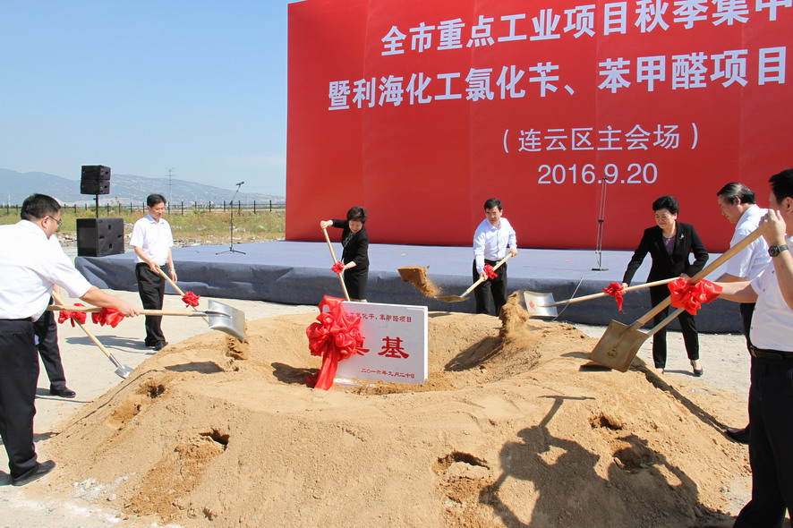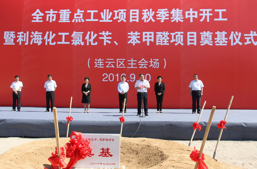 9月20日,我市重點工業(yè)項目秋季集中開工(連云區(qū)主會場)暨利?;ぢ然S、苯甲醛項目奠基儀式在利海公司舉行,市委書記、市人大常委會主任楊省世,市領導楊莉、董恕娟、徐家保、魯林,集團公司董事長、黨委書記楊龍、總經(jīng)理胡建明等出席開工儀式。