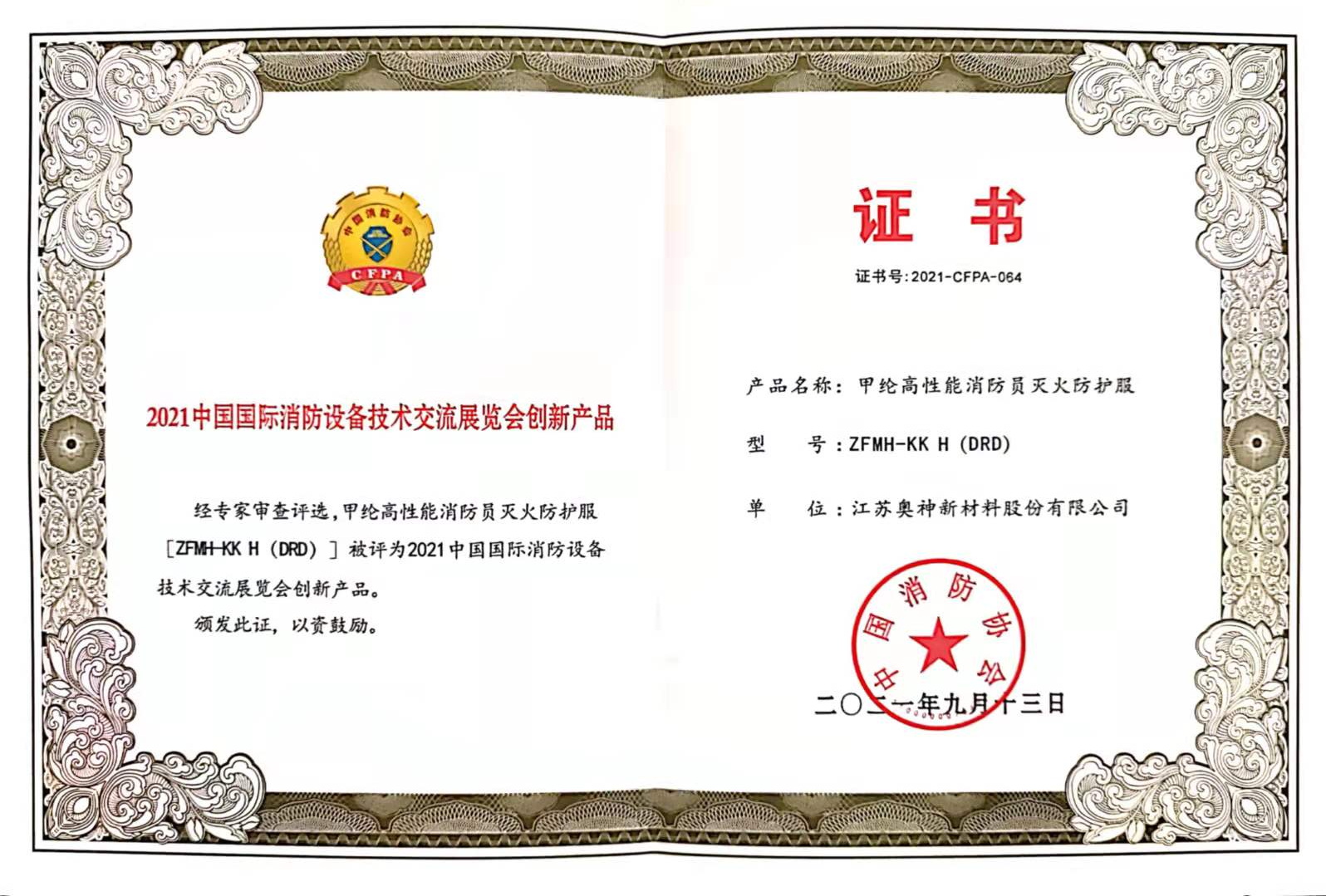 2021年10月12日,在北京召開的第十九屆中國國際消防設(shè)備技術(shù)交流展覽會上,江蘇奧神新材料股份有限公司研發(fā)的“甲綸高性能消防員滅火防護(hù)服”憑借優(yōu)異的性能獲得“2021中國國際消防設(shè)備技術(shù)交流展覽會創(chuàng)新產(chǎn)品”榮譽稱號。此次參與評選的都是來自全國各地實力雄厚的消防領(lǐng)域企業(yè),經(jīng)歷層層評選,甲綸高性能消防員滅火防護(hù)服脫穎而出,受到專家的一致好評。