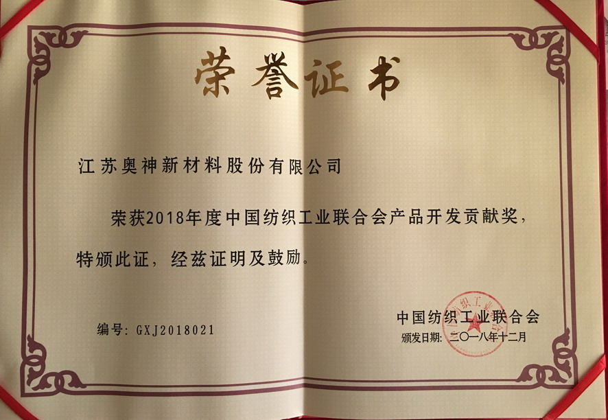 近日,在北京召開的2018年中國紡織創(chuàng)新年會上,江蘇奧神新材料股份有限公司獲得中國紡織工業(yè)聯(lián)合會頒發(fā)的“2018年度中國紡織工業(yè)聯(lián)合會產(chǎn)品開發(fā)貢獻(xiàn)獎”榮譽(yù)稱號。