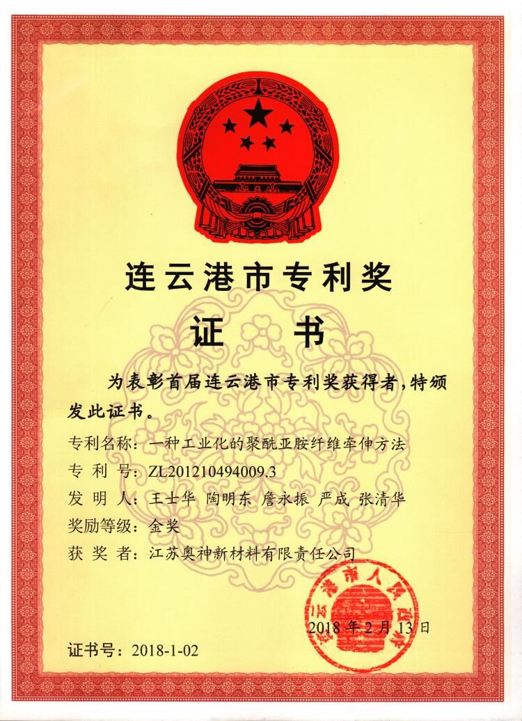 近日,連云港市政府發(fā)文,對(duì)首屆連云港市專利獎(jiǎng)獲獎(jiǎng)項(xiàng)目給予表彰,奧神新材料公司發(fā)明專利“一種工業(yè)化的聚酰亞胺纖維牽伸方法”獲得首屆連云港市專利金獎(jiǎng)。據(jù)悉,本屆專利金獎(jiǎng)有10項(xiàng)。