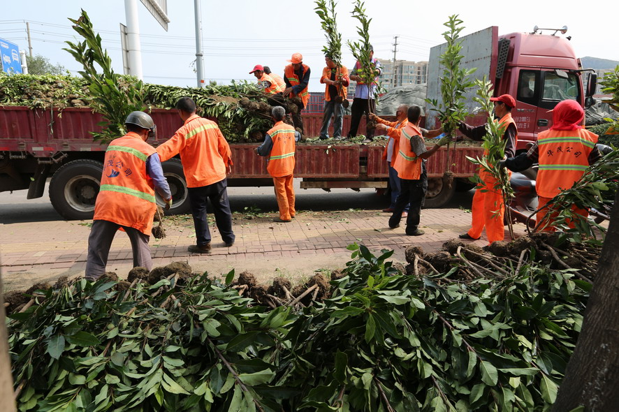 新光路鐵路橋至港城大道段南側(cè)綠化帶,因為人為踩踏、車輛碾壓導(dǎo)致綠化斑禿損壞嚴(yán)重,為盡快恢復(fù)綠化原貌,改善市容市貌。8月18日,裕升、裕欣養(yǎng)護(hù)公司組織80多名綠化工,從早上6點一直干到下午6點,卸苗、運苗、挖坑、插苗,烈日酷暑下奮戰(zhàn)一整天,中午在樹陰下吃點盒飯,喝點礦泉水,繼續(xù)工作,橘黃色工作被汗水浸透、被烈日烤干,這樣有好幾個來回?!敖裉煳覀円谶@片綠化補(bǔ)植紅葉石楠、金森女貞等模紋小苗1萬余株,紅葉石楠球等灌木110株,有效改善該路段綠化植被,提升城市形象,我們還要在黃海續(xù)道補(bǔ)植草坪近30000平方,在這條1000多米長的路段,有車輛維修點50多家,車輛出入,對路邊綠化帶傷害非常大,這一路段也是環(huán)衛(wèi)整治長期存在的‘老大難’,這次,在開發(fā)區(qū)行政執(zhí)法部門的配合下,我們要重新種植草坪,對這一‘老大難’路段植被進(jìn)行恢復(fù),另外德蘭南路、東路補(bǔ)植苗木近80萬元的綠化工程也已開工上土整土,接著要栽苗,根據(jù)開發(fā)區(qū)創(chuàng)衛(wèi)部署要求,上述這些事情必須在8月底完成,所以說時間相當(dāng)緊,職工們都冒著高溫,加班加點搶進(jìn)度?!惫靖笨偨?jīng)理郁宏峰說。
