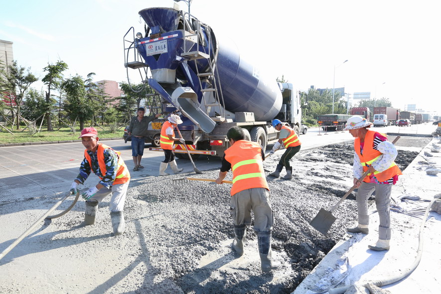在大港路“新光路至零公里”路段,筆者在水泥路上看到一塊塊被切割成方方正正的凹面,四周都架好防護(hù)欄等安全防護(hù)設(shè)施,在華東城北門偏東不遠(yuǎn)處,一臺挖掘機(jī)的鏟斗被換上沖擊破碎錘,正在一大塊破損的水泥路面沖擊破碎作業(yè),“嗒嗒嗒”的沖擊聲十分震耳。在與現(xiàn)場作業(yè)的盛達(dá)市政公司市政維修項目部副主任史如勤交流中得知,該路段是附近集團(tuán)箱基站進(jìn)出港口集裝箱車輛的重要通道,每天有好幾百輛集裝箱車輛進(jìn)出,水泥路面不堪重負(fù),損壞比較嚴(yán)重,根據(jù)開發(fā)區(qū)創(chuàng)衛(wèi)工作要求,由他們對該路段破損處進(jìn)行局面分割維修,整個路段維修面積達(dá)到5000多平方,為保證道路使用通行,采取半幅維修、邊破碎邊澆灌的方式,保證施工進(jìn)度,現(xiàn)正在維修北側(cè)路面,整個路面維修計劃在8月底完成?!耙驗閯?chuàng)衛(wèi),我們下一步還要對轄區(qū)內(nèi)的破損、歪到的路牙石進(jìn)行維修扶正,242路段瀝青破損路面維護(hù),還要開通四處道口,而現(xiàn)在事多人少,人手比較緊張,我們周六周日都沒有休息,就是想把創(chuàng)衛(wèi)工作任務(wù)一項一項地及時完成,決不能拖創(chuàng)衛(wèi)工作后腿?!彼呎f邊用肩上的毛巾擦著額頭上的汗水。