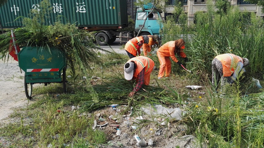 在昌圩湖環(huán)湖路南側(cè)一處公共廁所處,裕升養(yǎng)護(hù)公司20多名環(huán)衛(wèi)保潔工人正在清理公廁周邊的雜草、建筑垃圾,有的在割草、有的在搬磚、有的在推車,一個個汗流浹背,忙得不亦樂乎。正在現(xiàn)場忙碌的保潔大隊長劉保軍對筆者說:“這一塊段還沒有交給我們養(yǎng)護(hù),一直無人管理,雜草叢生,成為建筑、裝修垃圾的堆放地,根據(jù)開發(fā)區(qū)創(chuàng)衛(wèi)環(huán)境衛(wèi)生無死角要求和華茂公司生產(chǎn)技術(shù)部門指令,我們裕升養(yǎng)護(hù)公司承擔(dān)這一區(qū)域環(huán)境衛(wèi)生突擊整治任務(wù),從綠化保潔班組抽調(diào)20多人來搞突擊,大家面對天氣炎熱、工作量大、清理困難等因素,發(fā)揚不怕吃苦、敢打硬仗的華茂精神,奮戰(zhàn)在突擊現(xiàn)場,每個人都汗流不止,工作服全被汗水浸透,昨天我們已在這里整整干了一天,由于垃圾量大、雜草面積大,我們動用了裝載機(jī)等機(jī)械設(shè)備,運雜草的三輪車跑近百趟,清理建筑、裝修等垃圾數(shù)十噸。估計今天下午能夠全部結(jié)束?!?/span>
