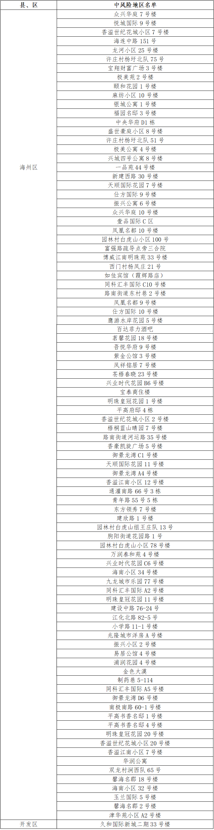 根據(jù)國務(wù)院聯(lián)防聯(lián)控機(jī)制有關(guān)規(guī)定,經(jīng)市指揮部研究決定,自發(fā)布之日起,對我市部分區(qū)域疫情風(fēng)險等級進(jìn)行調(diào)整:海州區(qū)九嶺社區(qū)北大荒西21號由中風(fēng)險地區(qū)調(diào)整為低風(fēng)險地區(qū)。其他地區(qū)風(fēng)險等級不變。調(diào)整后全市現(xiàn)有91個中風(fēng)險地區(qū)。 連云港市中風(fēng)險地區(qū)(91個)