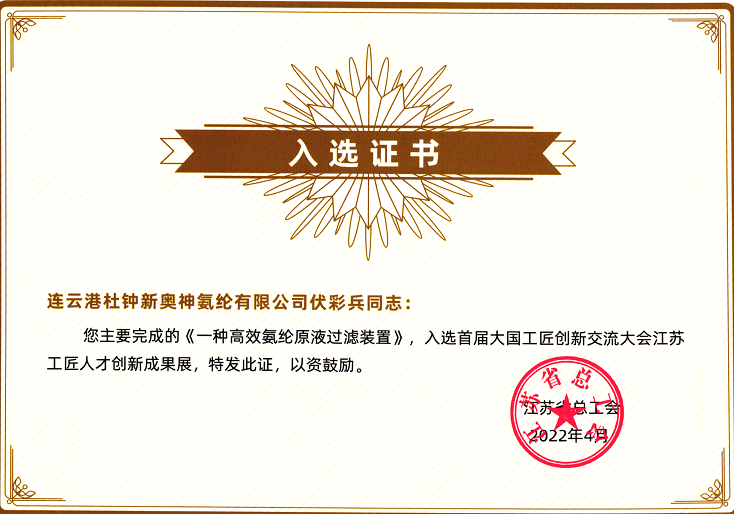 近日,全國總工會主辦首屆大國工匠創(chuàng)新交流大會,氨綸公司伏彩兵完成的《一種高效氨綸原液過濾裝置》創(chuàng)新成果入選大國工匠展,伏彩兵還入選了首屆大國工匠創(chuàng)新交流大會江蘇展區(qū)重點展示科創(chuàng)推薦通道。本次大會以“技能強國,創(chuàng)新有我”為主題,通過線上線下形式展示以大國工匠為代表的廣大職工的精湛技能和創(chuàng)新成果,為廣大高技能人才搭建交流平臺。