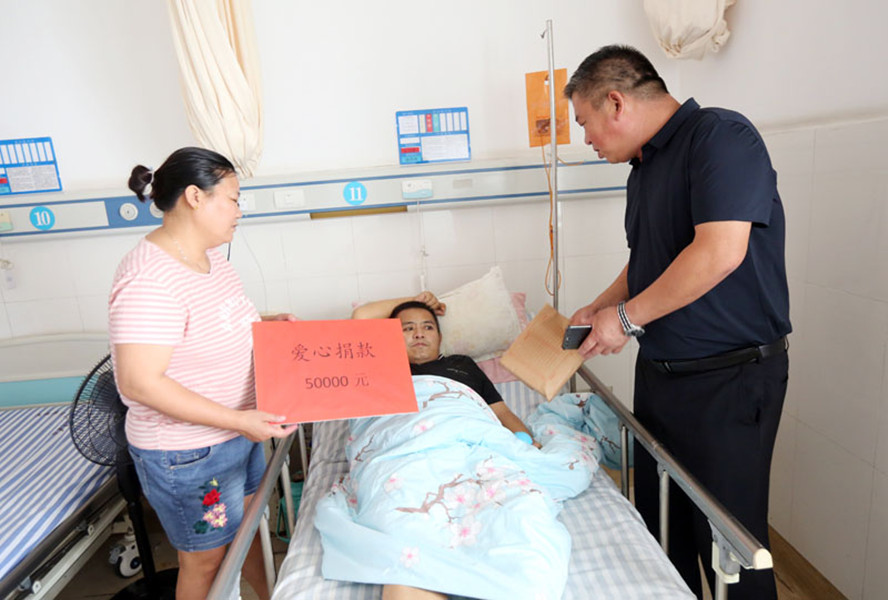 8月16日上午,徐圩投資公司總經理莊清付一行到市第二人民醫(yī)院看望正在住院治療的職工張聯(lián)君,并將5萬元職工愛心捐款交到他妻子朱敏的手中,讓他和家人感動萬分。