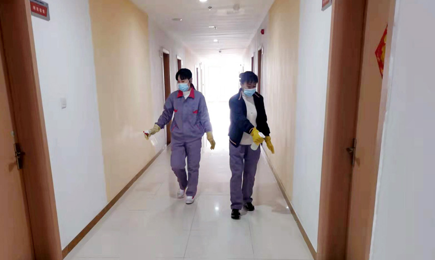 干凈整潔的辦公樓、宿舍樓里飄著淡淡的消毒水味道,清瘦干練的保潔員任禮勤正在仔細地打掃著樓道。5號疫情突發(fā)之時她正好當班,根據(jù)以往疫情經(jīng)驗,她果斷地把一直照料著的年邁母親安排給了大哥,此后便堅守在工作崗位上。疫情防控期間的工作量增加了不少,每天她和同事們分片作業(yè),在認真做好各自清潔區(qū)每日兩次的保潔、消毒工作的同時,還要負責就餐人員一日三餐的登記、測量體溫等工作。每天從早上7點開始,5位保潔員的身影便忙碌在公司的門廳、餐廳、樓道、電梯等場所,這一忙常常要到晚上6點多?!罢埬肯麦w溫”“今天你做核檢了嗎”,這些溫馨的話語幾乎成了她們對大家的問候語。