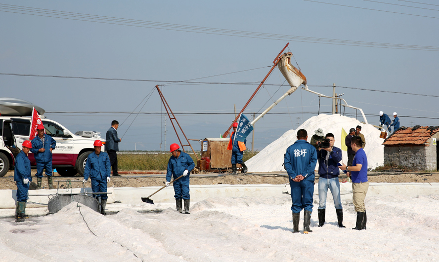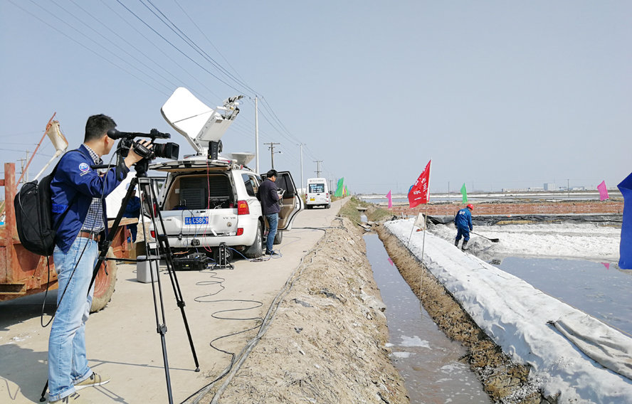 攝制組動用直播車、航拍、信號傳輸+高清攝像機等設(shè)備,工作人員各有分工,同步拍攝鹽田生產(chǎn)、鹽工勞動以及食鹽生產(chǎn)等淮鹽收獲的喜人畫面,記者更是在鏡頭的一路跟拍下,一邊自己動手操作,一邊與現(xiàn)場勞動的鹽工親切交談,向觀眾詳細解讀生態(tài)淮鹽灘曬生產(chǎn)和食鹽生產(chǎn)的工藝流程,為大家熟悉、了解和保護淮鹽提供一次直觀的認知機會。