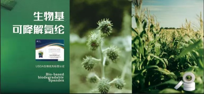公司以蓖麻油和玉米秸稈為原料,開發(fā)出生物基可降解氨綸,其生物碳含量最高可達 75%,獲得美國農(nóng)業(yè)部 (USDA)生物優(yōu)先標簽認證,產(chǎn)品具有生物可降解性能,在 75 天內(nèi)生物降解率可達到 11%,產(chǎn)品生產(chǎn)過程對環(huán)境環(huán)境影響小,根據(jù)SGS對產(chǎn)品全生命周期評估,生物基可降解氨綸相對常規(guī)氨綸產(chǎn)品可以減少50%的碳排放,此外,產(chǎn)品具備優(yōu)異的酸性可染功能和耐氯功能。