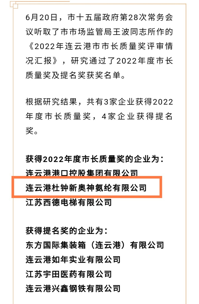 經(jīng)過自愿申報(bào)、資格審查、資料評(píng)審、現(xiàn)場評(píng)審、綜合評(píng)價(jià)審定公示和政府研究品準(zhǔn)共7個(gè)環(huán)節(jié),最終6月20日,連云港市市物價(jià)局政府第28次常務(wù)會(huì)議聽取了連云港市市場監(jiān)督局王波所做的《2022年連云港市市長質(zhì)量獎(jiǎng)評(píng)審情況匯報(bào)》,研究通過了2022年度市場質(zhì)量獎(jiǎng)和提名獎(jiǎng)的名單,確定了3家企業(yè)獲得2022年度市長質(zhì)量獎(jiǎng)、4家企業(yè)獲得提名獎(jiǎng),我公司榮獲2022年度市長質(zhì)量獎(jiǎng)。