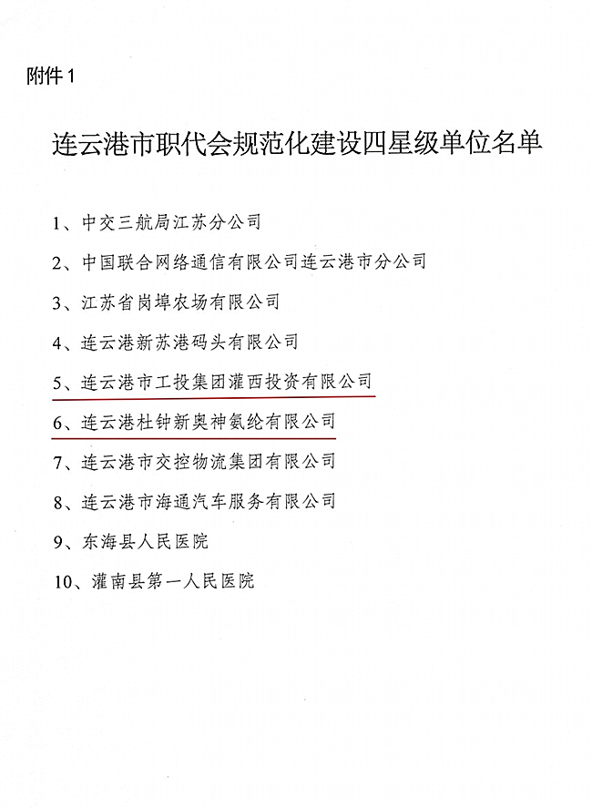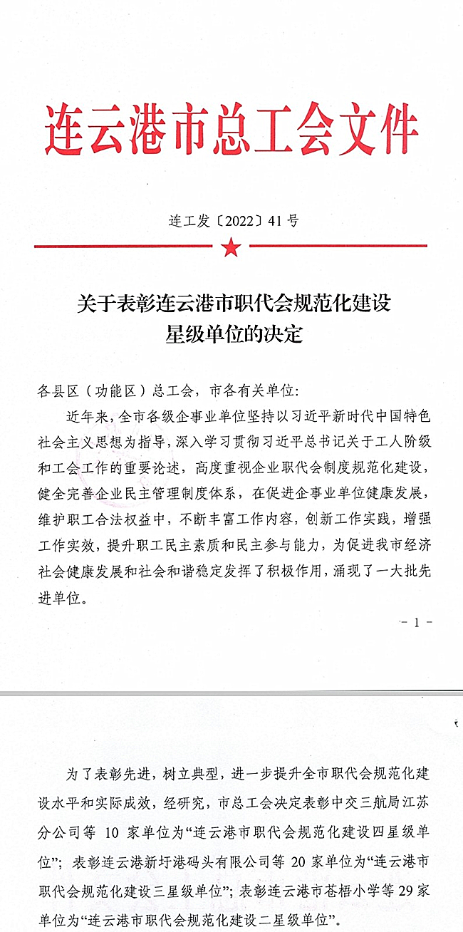 日前,從連云港市總工會(huì)傳來(lái)喜訊,我公司工會(huì)被授予“四星級(jí)職代會(huì)”榮譽(yù)稱(chēng)號(hào)。