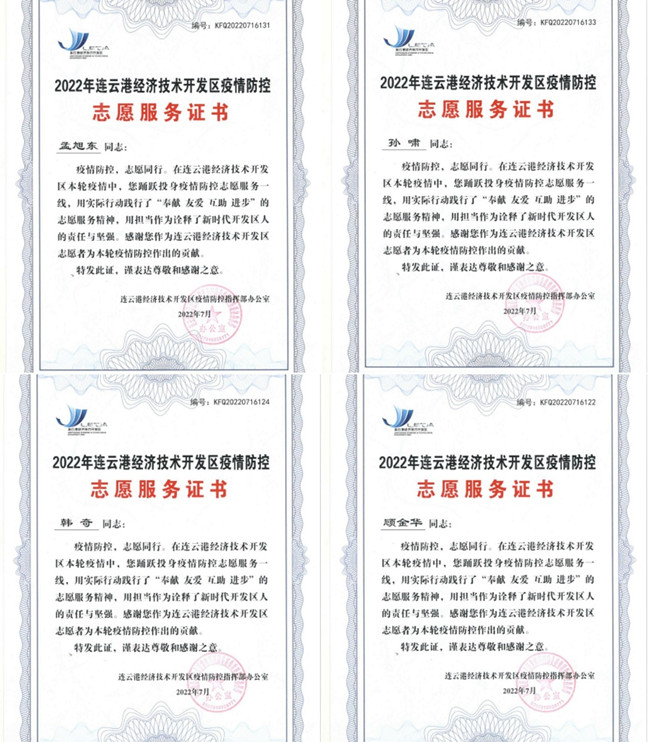 近日,連云港經(jīng)濟(jì)技術(shù)開發(fā)區(qū)領(lǐng)導(dǎo)來到公司,對氨綸公司積極參與疫情防控工作表示感謝,并向公司志愿者頒發(fā)了疫情防控榮譽(yù)證書,感謝他們在疫情防控中所作出的積極貢獻(xiàn)。