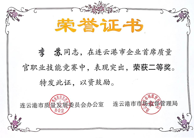 為貫徹落實(shí)省委政府《江蘇省質(zhì)量提升行動實(shí)施方案》精神,進(jìn)一步推動連云港市企業(yè)高質(zhì)量發(fā)展,市質(zhì)量發(fā)展委員會辦公室和市市場監(jiān)督局聯(lián)合與6月份舉辦了2022年連云港市企業(yè)首席質(zhì)量官職業(yè)技能競賽。氨綸公司代表李蘇同志發(fā)揚(yáng)勇于拼搏、不驕不躁的競賽精神,獲得了此次競賽二等獎。