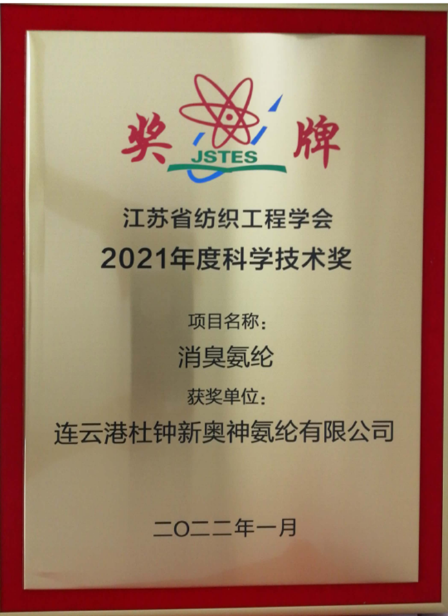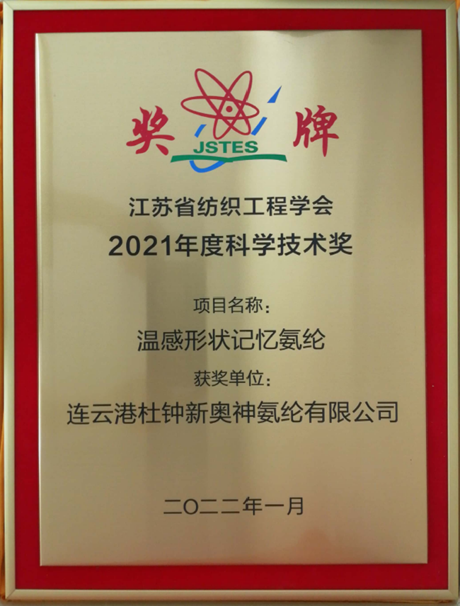 日前,杜鐘氨綸公司2021年申請參評的兩項自主研發(fā)新產品《溫感形狀記憶氨綸》、《消臭氨綸》被授予江蘇省紡織工程學會2021年度科學技術獎。