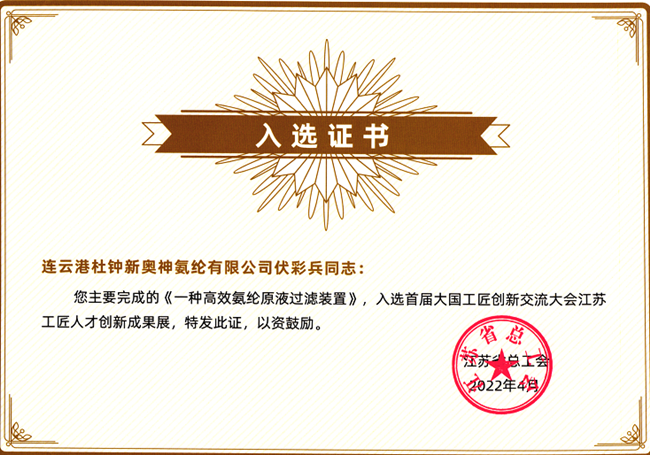 根據(jù)省、市總工會(huì)部署要求,氨綸公司積極組織工匠人才參展。經(jīng)評(píng)選,公司伏彩兵主要完成的《一種高效氨綸原液過(guò)濾裝置》創(chuàng)新成果入選大國(guó)工匠展,伏彩兵還入選了首屆大國(guó)工匠創(chuàng)新交流大會(huì)江蘇展區(qū)重點(diǎn)展示科創(chuàng)推薦通道。