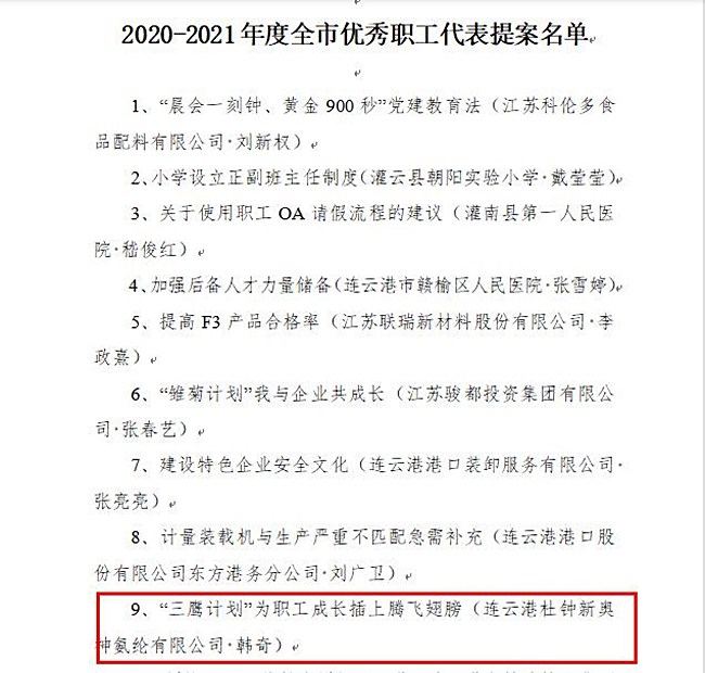 日前,市總工會開展全市優(yōu)秀職工代表提案征集推薦活動評選結(jié)果正式公布,杜鐘氨綸公司《“三鷹計劃”為職工成長插上騰飛翅膀》榮獲全市優(yōu)秀職工代表提案。