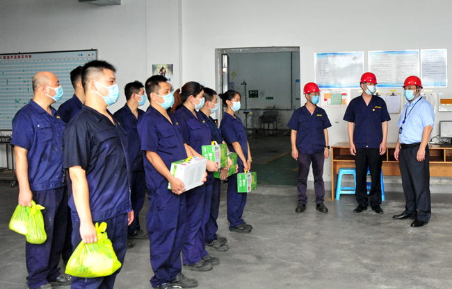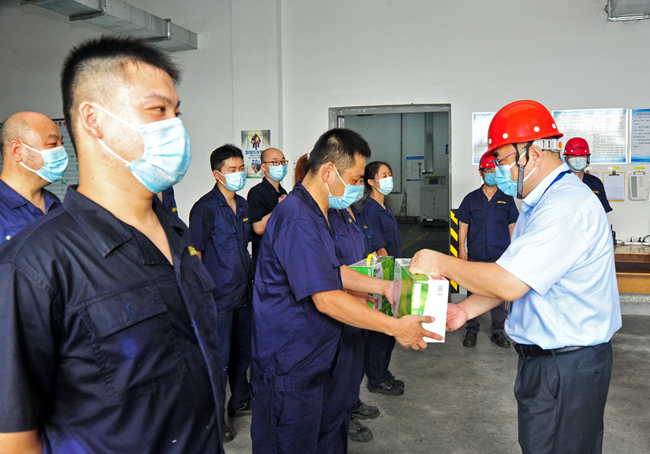 進(jìn)入盛夏以來(lái)持續(xù)高溫,為向堅(jiān)守崗位的一線職工表達(dá)敬意和關(guān)懷。8月2日上午,集團(tuán)黨委書記、董事長(zhǎng)楊龍一行人來(lái)我公司慰問(wèn)高溫工作環(huán)境下的一線員工,公司黨委書記胡傳法、副總經(jīng)理張華衛(wèi)陪同。