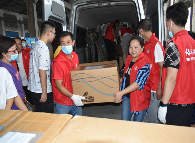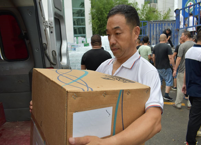 中午十二點(diǎn),第一批物資捐贈(zèng)后,顧不得吃飯我們就奔赴第二個(gè)捐贈(zèng)點(diǎn)滎陽(yáng)紅十字會(huì)。路上交警為我們耐心引導(dǎo),仔細(xì)說(shuō)明哪里有塌方,哪里可以通行,臨行還貼心的留下微信號(hào)碼,囑咐道:在鄭州遇到困難隨時(shí)聯(lián)系。到達(dá)后不出意外的開(kāi)始排隊(duì),看著其他志愿者熱火朝天的忙碌,我和同行的小孫心里很不是滋味:我們千里迢迢帶著集團(tuán)公司黨委和公司黨委的重托和港城人民的美好祝愿來(lái)到災(zāi)區(qū),我們不僅僅是要來(lái)捐贈(zèng)物資,是不是也該做點(diǎn)什么?幾經(jīng)請(qǐng)示,紅會(huì)組織人員終于答應(yīng)了我們的請(qǐng)求,同意我們作為臨時(shí)志愿者加入搬運(yùn)捐贈(zèng)物資的隊(duì)伍。雖然大家已經(jīng)兩天沒(méi)合眼了,但是當(dāng)穿上志愿者馬甲后,我們頓時(shí)精神煥發(fā),立刻投入到緊張有序的搬運(yùn)工作中。托舉起每一件來(lái)自祖國(guó)各地捐贈(zèng)物資,心里都暖暖的,因?yàn)檫@里充滿了來(lái)自大江南北人們深深的祝福,激動(dòng)的心情難以言表。此刻,我們對(duì)“眾志成城”有了更深刻的理解。