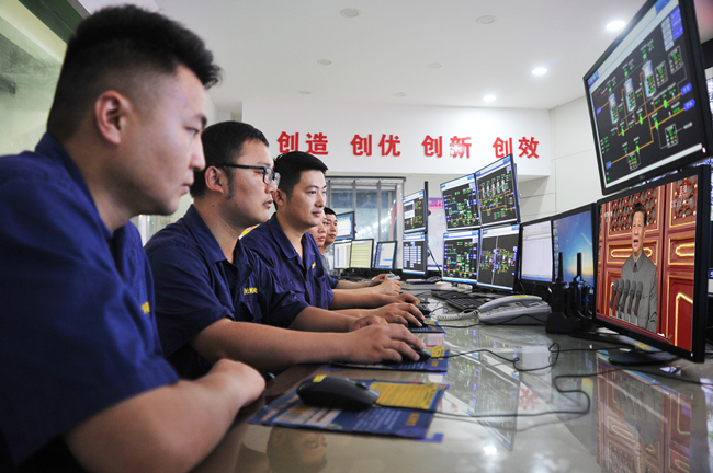 生產(chǎn)一部員工在操作現(xiàn)場(chǎng)觀看慶祝大會(huì)。