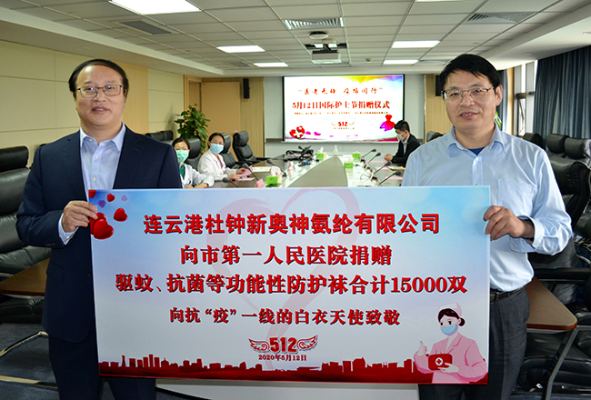 5月12日,連云港杜鐘氨綸有限公司在市總工會的帶領下來到連云港市第一人民醫(yī)院開展愛心捐贈活動。氨綸公司與國內(nèi)知名襪業(yè)公司俏佳人合作使用奧神專利產(chǎn)品訂制了一批“防脫散襪”、驅(qū)蚊襪、抗菌防臭襪等功能性防護襪,共計捐贈15000雙。市總工會副主席、女職委主任秦云;連云港市工業(yè)投資集團工會主席劉承志;市第一人民醫(yī)院副院長、工會主席胡蓉,副院長李明星;連云港杜鐘新奧神氨綸有限公司總經(jīng)理張斌,副總經(jīng)理劉明珠等領導出席捐贈儀式。