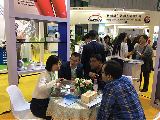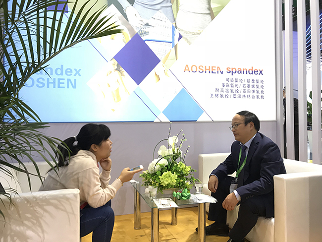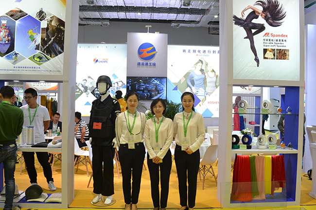 展覽會(huì)上,化纖協(xié)會(huì)王會(huì)長(zhǎng)帶領(lǐng)的貴賓參觀團(tuán)一行親臨我公司展位進(jìn)行參觀交流。其他前來(lái)咨詢、洽談業(yè)務(wù)的國(guó)內(nèi)外客商絡(luò)繹不絕,氨綸公司的8大系列產(chǎn)品成為大家關(guān)注的焦點(diǎn),來(lái)自孟加拉、印度、土耳其、日本等國(guó)家的客商紛紛表達(dá)了與公司深入合作的強(qiáng)烈意向,大家特別對(duì)公司新品石墨烯氨綸、低溫?zé)嵴澈习本]等產(chǎn)生了濃厚的興趣。展覽會(huì)上,氨綸公司總經(jīng)理張斌接受了化纖協(xié)會(huì)和紡織報(bào)的專題采訪,張總詳細(xì)介紹了公司大力實(shí)施差別化戰(zhàn)略,在引領(lǐng)氨綸行業(yè)流行趨勢(shì)過(guò)程中,重視新品研發(fā)、品質(zhì)保證、品牌打造方面的生動(dòng)實(shí)踐。神特新材和奧神新材分別展示了超高分子量聚乙烯纖維防彈系列產(chǎn)品和聚酰亞胺防火耐高溫系列產(chǎn)品,廣大客商紛紛駐足參觀,垂詢交流。