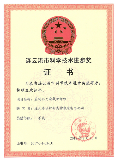 2017年我公司經(jīng)過網(wǎng)上申報,政府公示、專家評審、現(xiàn)場答辯等評審程序,最終公司高新技術(shù)產(chǎn)品《差別化無染氨綸纖維》獲得市政府授予的2017度連云港市科學(xué)技術(shù)進(jìn)步獎一等獎榮譽(yù)稱號。