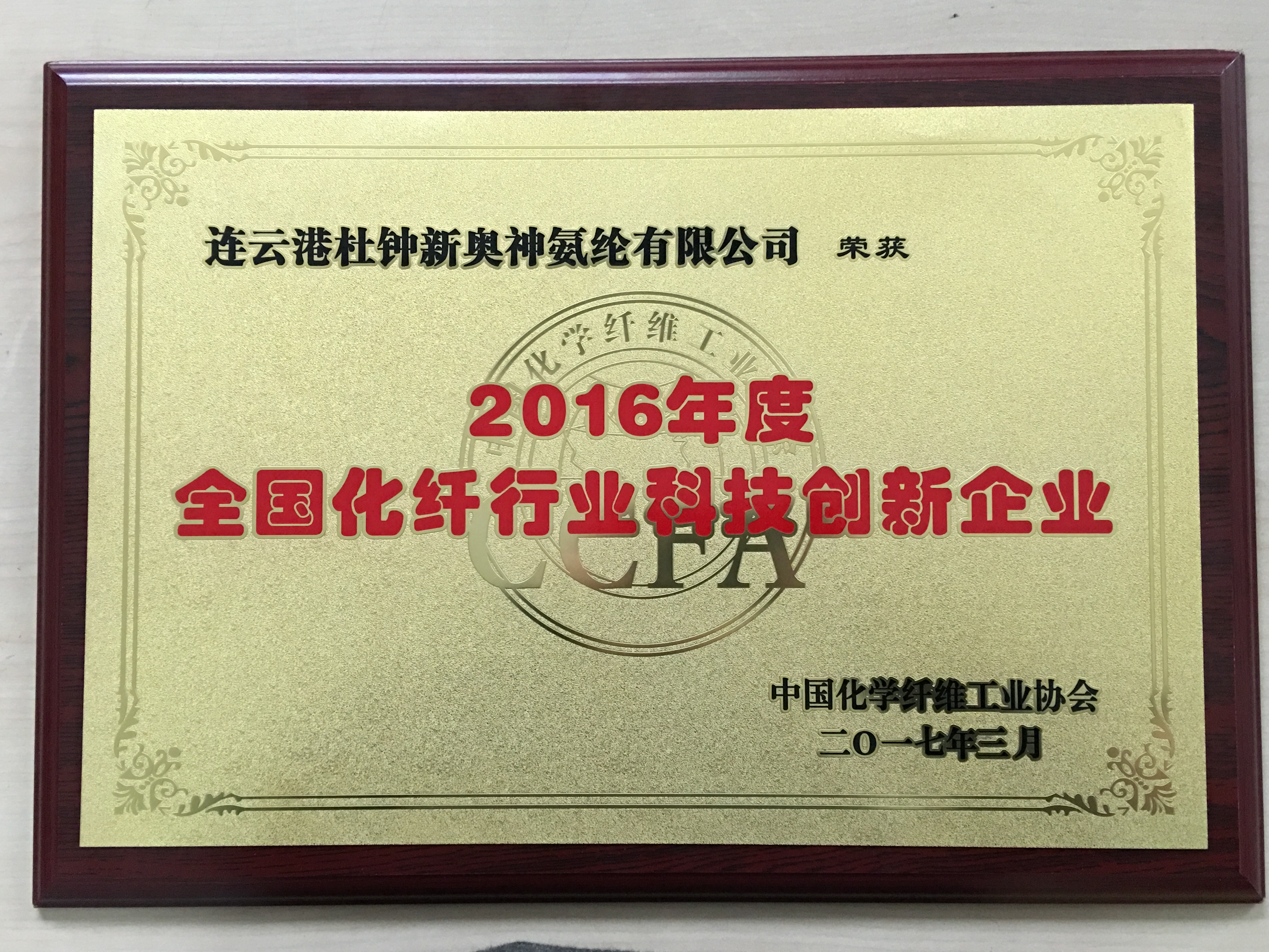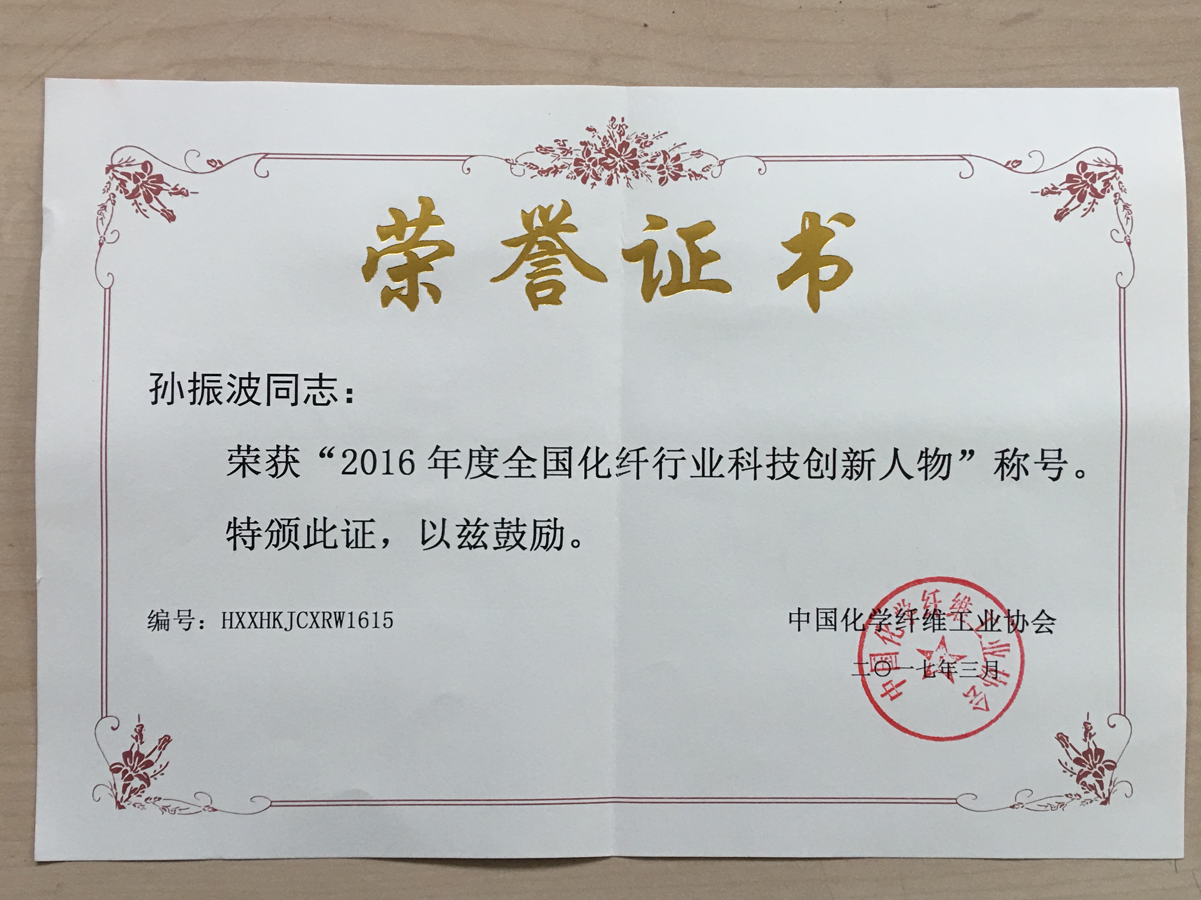 中國化學(xué)纖維工業(yè)協(xié)會(huì)第六屆第三次理事會(huì)暨中國化纖行業(yè)創(chuàng)新發(fā)展論壇于3月14日—15日在上海虹橋賓館召開。我公司獲“2016年度全國化纖行業(yè)科技創(chuàng)新示范企業(yè)”、孫振波獲”2016年度全國化纖行業(yè)科技創(chuàng)新人物“榮譽(yù)稱號(hào)。