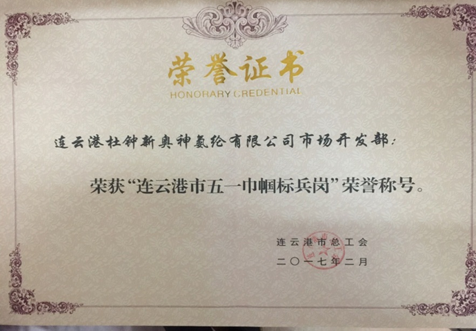 在集團(tuán)公司的指導(dǎo)關(guān)心下,連云港杜鐘新奧神氨綸有限公司市場開發(fā)部團(tuán)結(jié)一致、攻堅(jiān)克難,在市場開拓方面做出了突出貢獻(xiàn)。經(jīng)連云港市總工會(huì)評(píng)選,榮獲“連云港市五一巾幗標(biāo)兵崗”榮譽(yù)稱號(hào)。