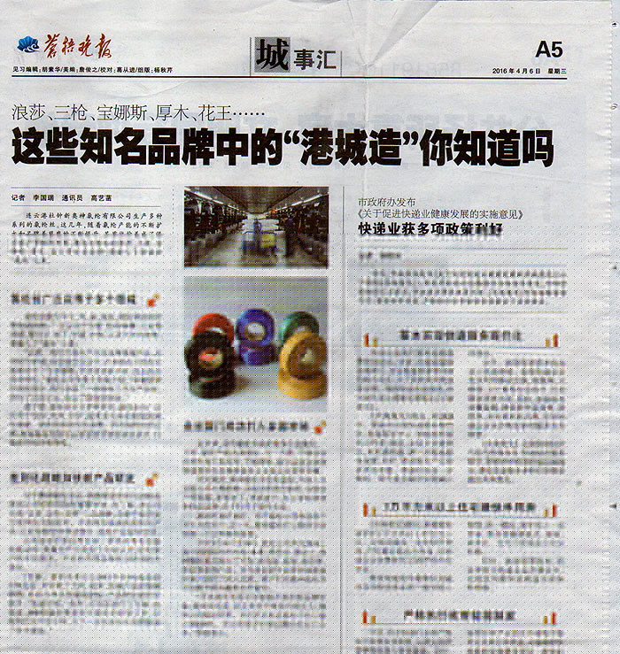 2016年4月6日,我市知名報刊《蒼梧晚報》采用黑體粗字標題,濃墨重彩的大篇幅報道了氨綸公司多種系列的氨綸絲產(chǎn)品,像大眾熟知的浪莎、寶娜斯、厚木、花王等知名品牌都跟氨綸公司合作多年,大家身邊觸手可及的國際國內(nèi)日常品牌都融入了港城的“氨綸”元素。向港城人民展示了氨綸公司產(chǎn)品在多種領(lǐng)域的應用。 目前,氨綸公司正在大力實施差別化戰(zhàn)略,加快新產(chǎn)品研發(fā)推廣,力爭讓更多的氨綸“港城造”走出國門,亮相國際市場。