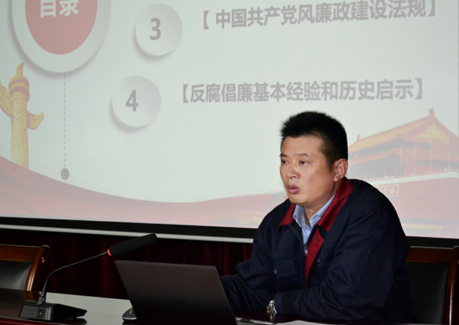 11月6日下午,杜鐘氨綸公司開展廉政黨課教育活動,黨委委員、紀(jì)委書記劉殿龍以《黨風(fēng)廉政建設(shè)永遠在路上》為題,為公司黨員干部、全體管理人員上了一堂廉政黨課。