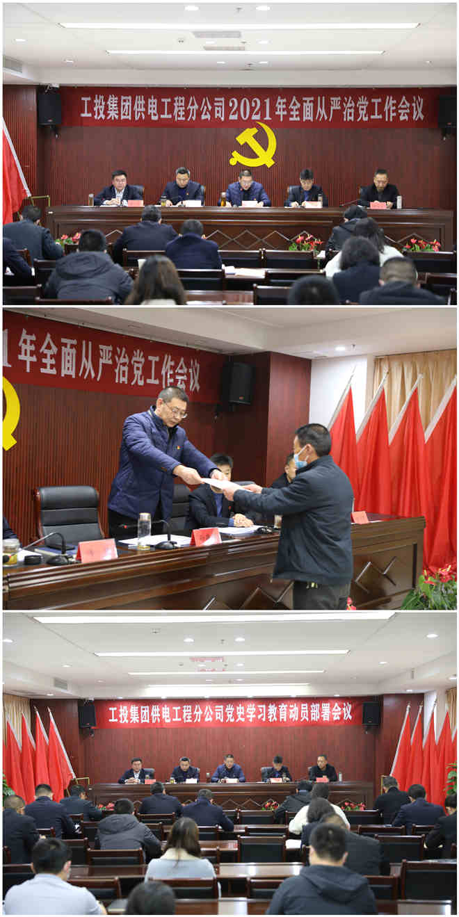 上半場,在公司2021年全面從嚴治黨工作會議上,全體參會人員首先觀看了全面從嚴治黨工作警示教育片。隨后,黨委書記、經(jīng)理孫政權(quán)在題為《強化政治建設 聚焦深度融合 以大黨建引領公司高質(zhì)量發(fā)展新征程》的黨委工作報告中指出,過去的一年,面對新冠疫情和經(jīng)濟下行的雙重壓力,公司黨委深入學習貫徹習近平新時代中國特色社會主義思想,以“不忘初心、牢記使命”主題教育為主線,扎實開展“雙融雙創(chuàng)”黨內(nèi)主題教育實踐活動,壓實管黨治黨責任、勇于直面困難挑戰(zhàn),推動公司經(jīng)濟在逆境中取得突破,黨建工作取得了顯著成效。報告強調(diào),2021年黨委工作的指導思想是:深入學習貫徹習近平新時代中國特色社會主義思想、十九屆五中全會精神等內(nèi)容,以“全面從嚴治黨”為統(tǒng)領,以“黨史學習教育”為主線,以打造“工電先鋒”黨建品牌為抓手,扎實開展“奮進新時代、領航開新篇”黨內(nèi)主題教育活動,以“大黨建”整合力量、凝聚人心,發(fā)揮黨的關鍵引領作用,將黨的政治優(yōu)勢轉(zhuǎn)化為發(fā)展優(yōu)勢。團結(jié)帶領廣大干部員工,統(tǒng)一思想、凝聚力量,勇于擔當、開拓進取,加大改革創(chuàng)新、轉(zhuǎn)型升級、管理提升推動力度,開創(chuàng)工投供電高質(zhì)量發(fā)展新局面,以改革發(fā)展優(yōu)異成績向建黨100周年獻禮,為扛起“爭當表率、爭做示范、走在前列”重大使命、奪取“十四五”發(fā)展開局首勝作出貢獻。圍繞上述總體要求,重點做好五個方面工作:持續(xù)深化政治建設,推進黨建經(jīng)濟深度融合;持續(xù)強化基層基礎,構(gòu)建企業(yè)大黨建格局;持續(xù)推進人才隊伍建設,增強高質(zhì)量發(fā)展推動力;持續(xù)推進黨風廉政建設,推進全面從嚴治黨向縱深發(fā)展;持續(xù)推進和諧企業(yè)創(chuàng)建,維護和諧穩(wěn)定發(fā)展的良好局面。