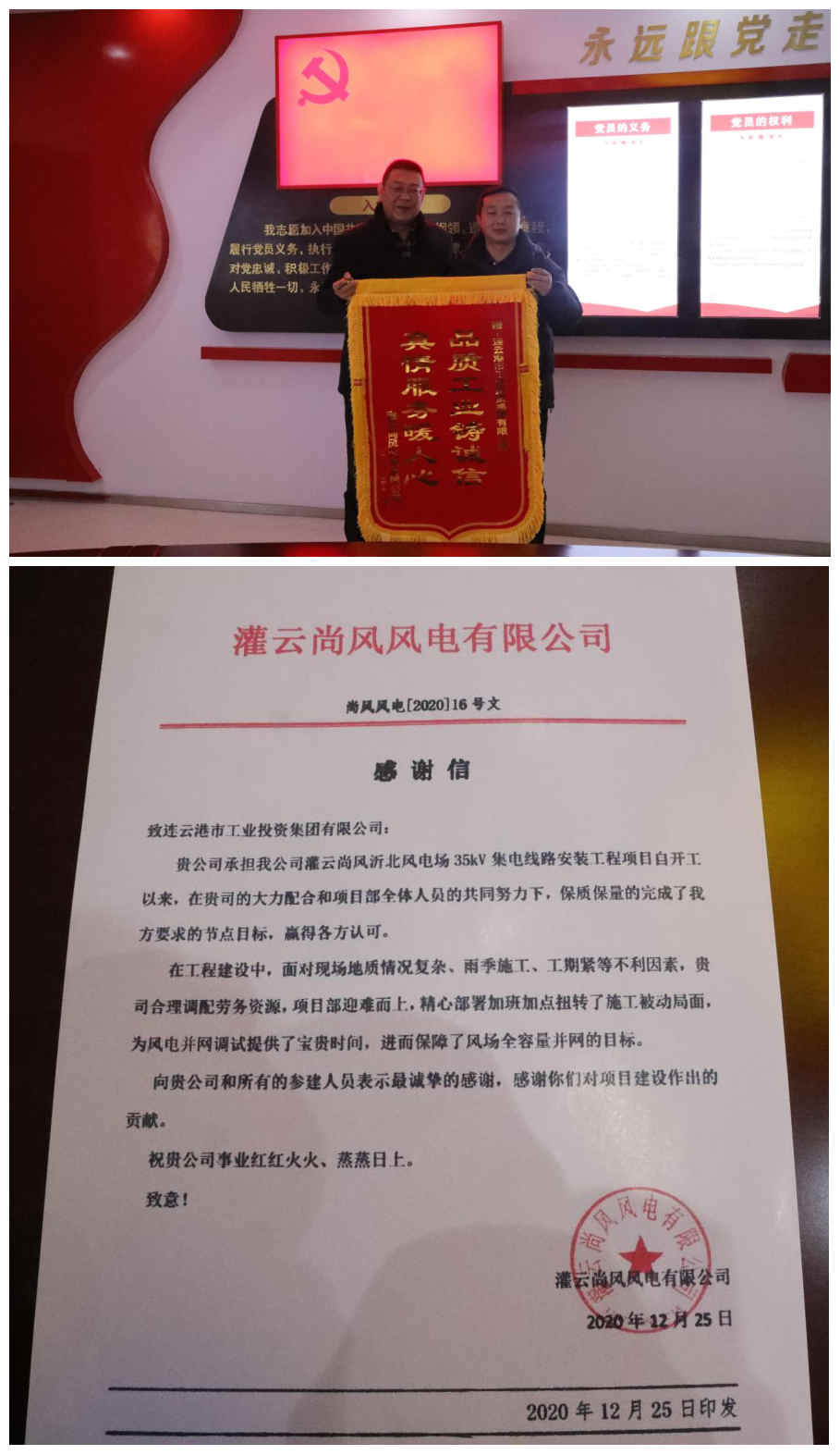 灌云尚風(fēng)風(fēng)電有限公司在《感謝信》中這樣寫道:“在工程建設(shè)中,面對(duì)現(xiàn)場(chǎng)地質(zhì)情況復(fù)雜、雨季施工、工期緊等不利因素,貴司合理調(diào)配勞務(wù)資源,項(xiàng)目部迎難而上,精心部署加班加點(diǎn)扭轉(zhuǎn)了施工被動(dòng)局面,為風(fēng)電并網(wǎng)調(diào)試提供了寶貴時(shí)間,進(jìn)而保障了風(fēng)場(chǎng)全容量并網(wǎng)的目標(biāo)。向貴公司和所有的參建人員表示最誠摯的感謝,感謝你們對(duì)項(xiàng)目建設(shè)作出的貢獻(xiàn)。祝貴公司事業(yè)紅紅火火、蒸蒸日上!”(電宣)