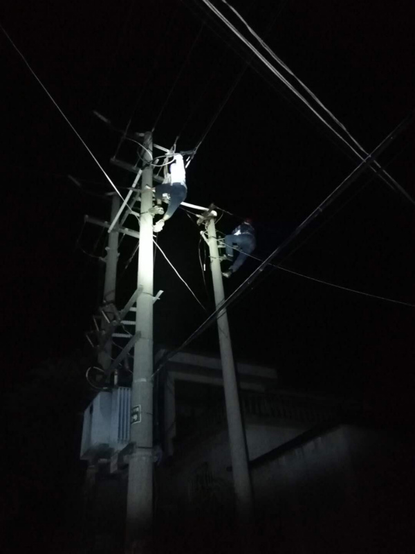 8月5日晚,接到報修電話的值班人員,帶好隨身工具立即到達(dá)黃沙一隊查看情況。借著手電發(fā)現(xiàn)一組引線已經(jīng)燒毀。正值天氣炎熱,為了保證居民正常用電,值班人員一邊安撫居民,一邊聯(lián)系值班領(lǐng)導(dǎo)說明情況。值班人員回到所里立即準(zhǔn)備搶修材料,值班領(lǐng)導(dǎo)聯(lián)系家住在附近的員工前來支援搶修工作。經(jīng)過近一個半時的奮戰(zhàn),恢復(fù)了居民的用電??匆娂壹覒魬袅疗鹆藷艄猓瑴喩頋裢傅膿屝奕藛T才舒了一口氣。( 盧正遷)