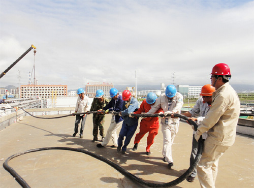 此項(xiàng)工程線路鋪設(shè)需經(jīng)過(guò)300多米地下頂管、200多米的空中橋架和多個(gè)電纜井。較之以往施工難度更大:一是高空作業(yè)多,施工進(jìn)度難以把握;二是人員負(fù)荷大,電纜需穿過(guò)多處交叉橋架,工程機(jī)械不能較好的發(fā)揮作用,大量的工作需要人力完成;三是天公不作美,從30日開(kāi)始,陣雨雷雨不斷,現(xiàn)場(chǎng)施工人員的衣服也多次濕透。
