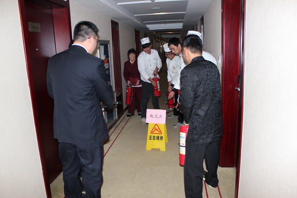 在演練時,在接到報警電話的第一時間內(nèi),總經(jīng)理迅速的趕到消防控制室,統(tǒng)一指揮大家有序進行安全疏散和逃生,客房以及餐廳的員工分頭進行電話和敲門通知并帶領樓層客人用濕毛巾捂住口鼻、彎下身體,依據(jù)疏散路線快速、有序地下樓疏散到了大廳。各部門義務消防員在接到火警通知的第一時間內(nèi),迅速組織滅火力量趕到起火點,用滅火器對初期火災進行了撲救。整個演練活動緊張有序。