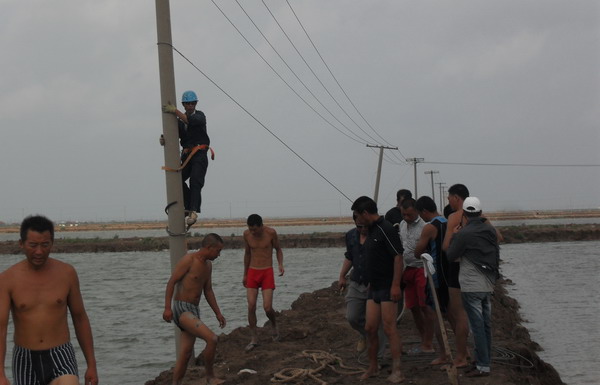 8月2日21時30分,“達維”在鹽城陳家港鎮(zhèn)登陸,帶來狂風暴雨。所轄供電范圍比鄰陳家港鎮(zhèn),臺風造成電力設(shè)施損壞,多條10KV線路停電。該所啟動重大氣象災(zāi)害應(yīng)急預(yù)案,全所職工在崗待命搶修, 8月3日凌晨3時30分有全部到崗工作。4時,職工分頭對線路進行巡視檢查,在第一時間發(fā)現(xiàn)故障點,以便搶修。該所主要領(lǐng)導主動與重要客戶聯(lián)系,及時掌握情況,組織人員搶修。廣大搶修職工不怕困難,不怕疲勞連續(xù)作戰(zhàn),盡快恢復(fù)和保證生產(chǎn)生活用電,發(fā)揮了供電人特別能戰(zhàn)斗的精神。由于電桿倒在水中,給立桿帶來了困難,大家主動脫去衣服,跳入到半腰身的水中搶修,有的解線,有的打拉線,個個干得一身汗,一身泥。