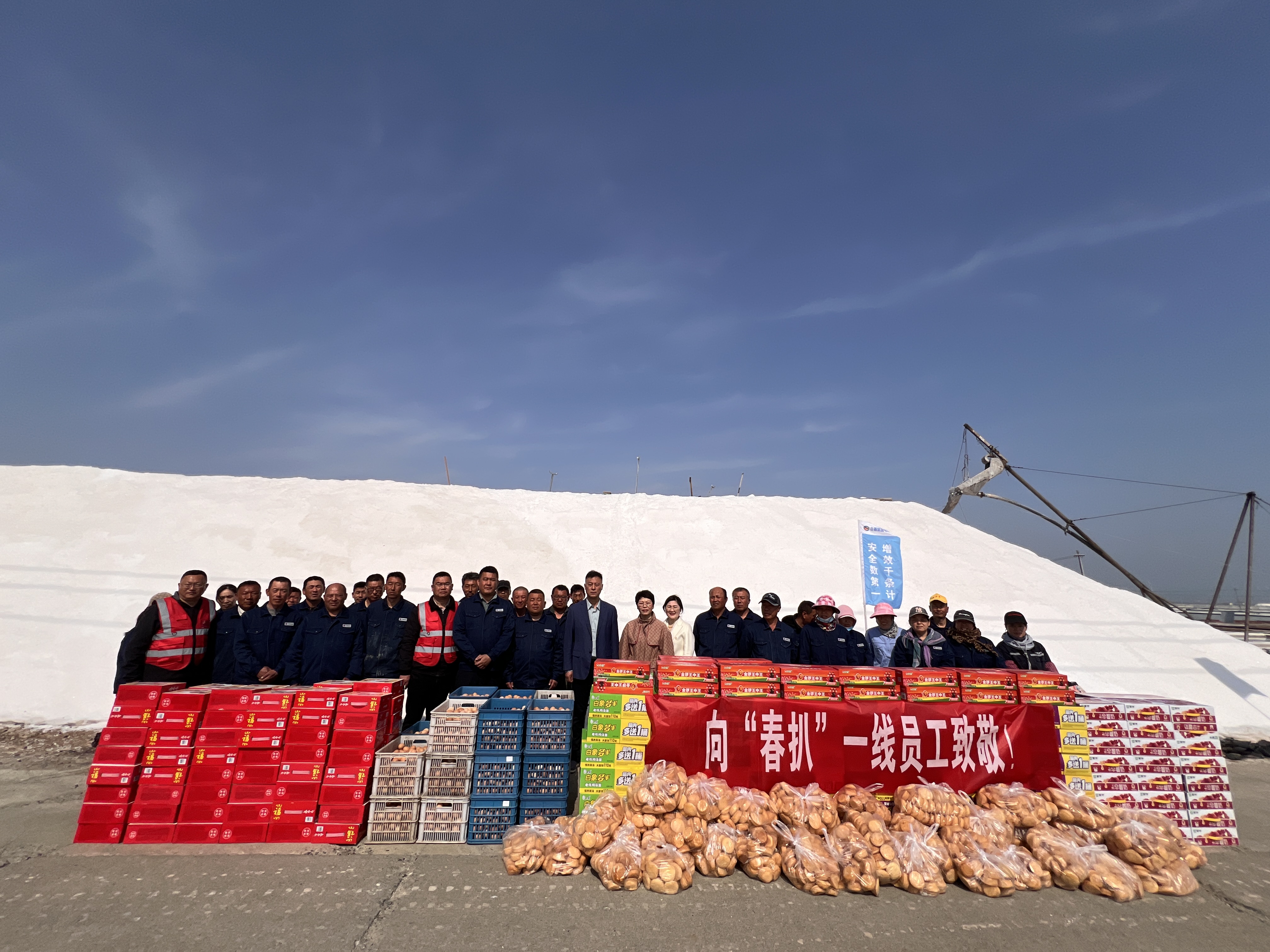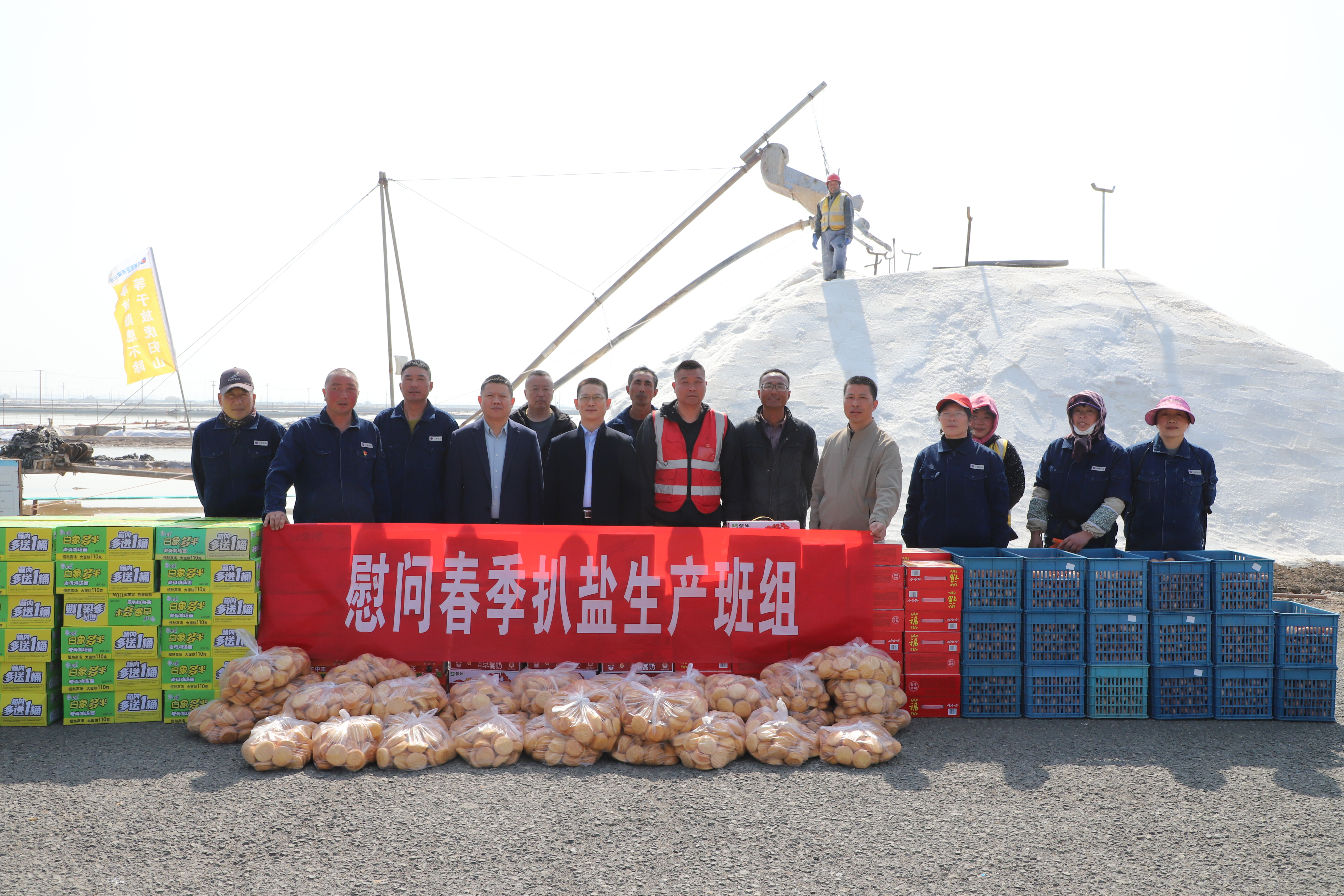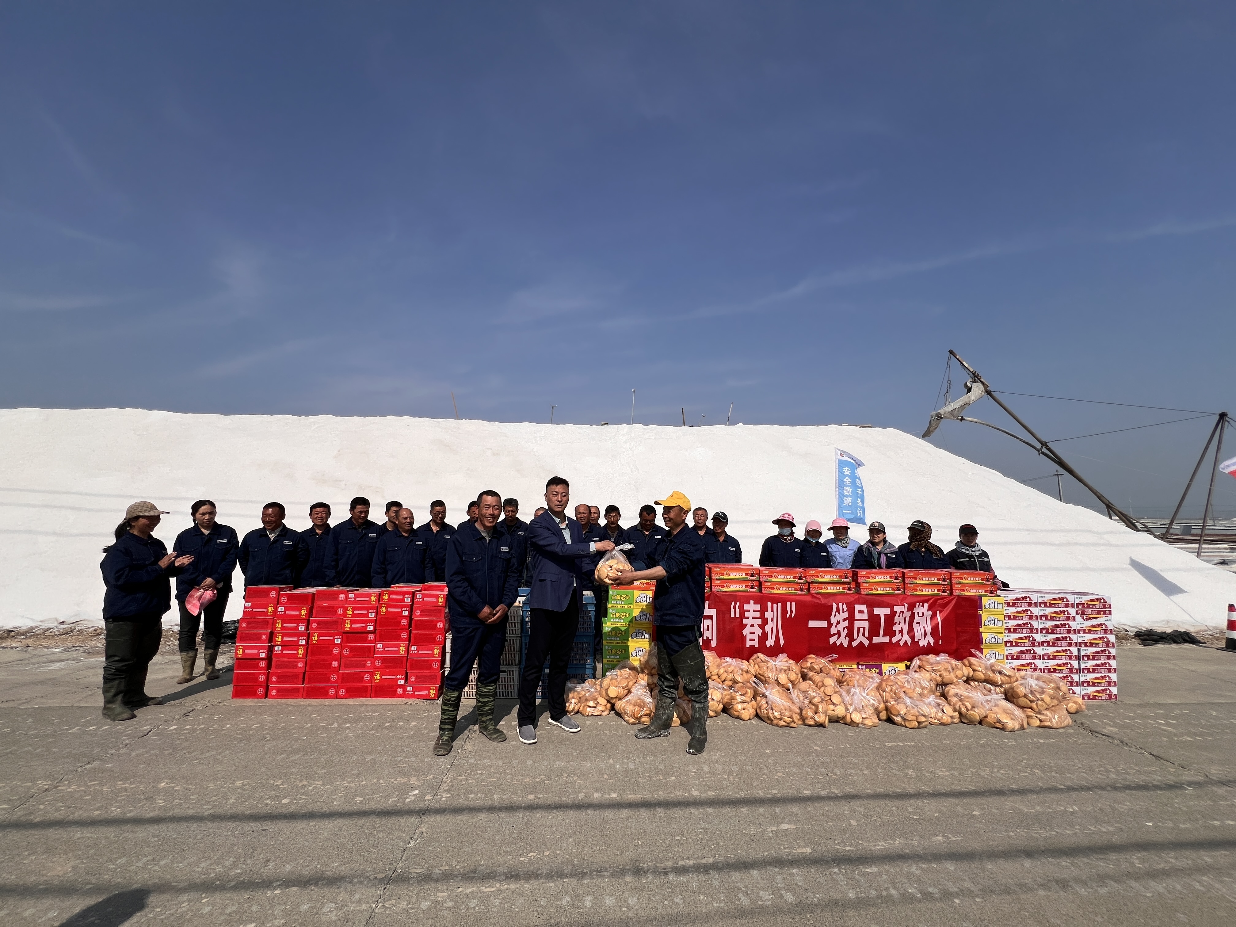 “你們辛苦了,我代表公司來看望大家?!痹谛潞邮嗯c埒南十一班,吳衛(wèi)平與扒鹽現(xiàn)場(chǎng)職工握手問好,感謝他們?cè)谶^去的一年為日曬制鹽公司的原鹽生產(chǎn)所付出的辛勤努力,叮囑他們一定要落實(shí)落細(xì)扒鹽生產(chǎn)措施,增強(qiáng)責(zé)任感和警覺性,嚴(yán)格執(zhí)行各項(xiàng)規(guī)章制度,切實(shí)保障扒鹽期間的安全生產(chǎn),并送上雞蛋、八寶粥、方便面、牛奶等物品。
