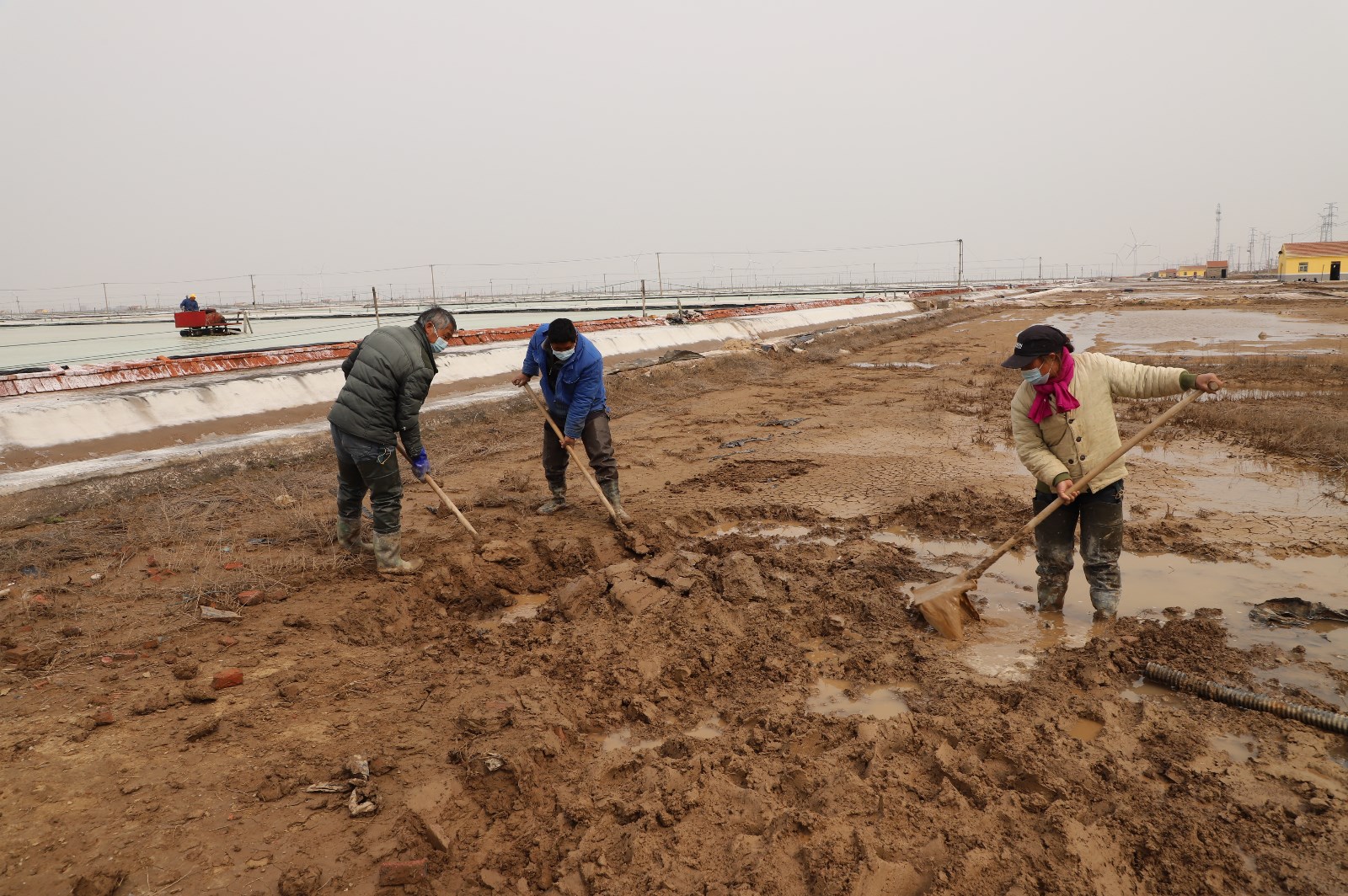 3月28日清晨,在通往日曬制鹽新河、埒南分公司入口處,戴著口罩的工人們依次接受測(cè)溫、亮碼、登記,有序進(jìn)入各生產(chǎn)班組。灘頭上,工人們分散作業(yè),忙著修補(bǔ)塑造、整理廩基……無(wú)論是從灘頭到塘頭,還是從碼頭到田頭,處處都呈現(xiàn)出熱火朝天、大干快上的場(chǎng)景。