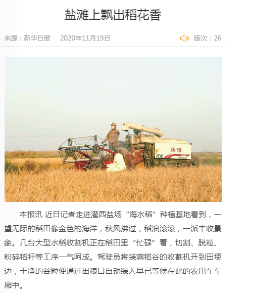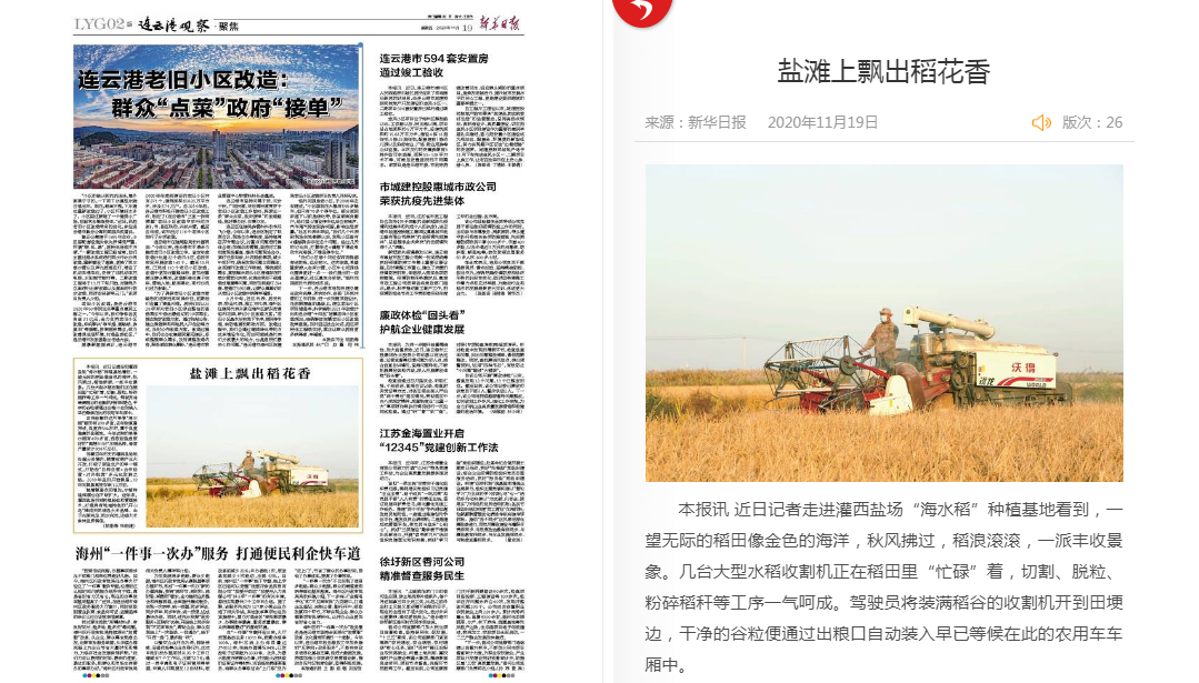 近日記者走進灌西鹽場“海水稻”種植基地看到,一望無際的稻田像金色的海洋,秋風拂過,稻浪滾滾,一派豐收景象。幾臺大型水稻收割機正在稻田里“忙碌”著,切割、脫粒、粉碎稻稈等工序一氣呵成。駕駛員將裝滿稻谷的收割機開到田埂邊,干凈的谷粒便通過出糧口自動裝入早已等候在此的農(nóng)用車車廂中。
