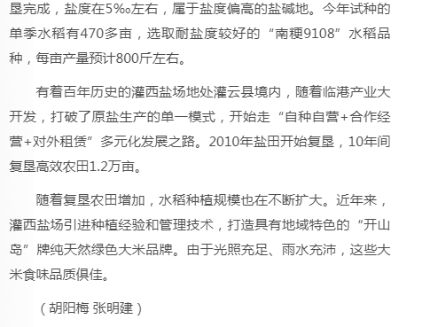 有著百年歷史的灌西鹽場地處灌云縣境內(nèi),隨著臨港產(chǎn)業(yè)大開發(fā),打破了原鹽生產(chǎn)的單一模式,開始走“自種自營+合作經(jīng)營+對外租賃”多元化發(fā)展之路。2010年鹽田開始復墾,10年間復墾高效農(nóng)田1.2萬畝。
