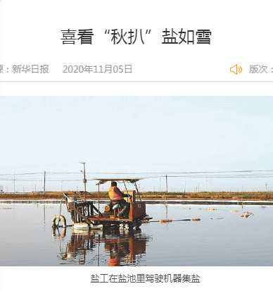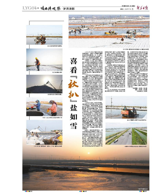 “今天這個(gè)鹽池,正好扒的海鹽。海鹽是我們千年的傳承,我們每年保留了5萬噸海鹽。海鹽吃起來香,因?yàn)樗然c含量在96%左右,剩下的都是微量元素,尤其是含鎂量比較高。這5萬噸海鹽,賣價(jià)并不比礦鹽高,但這是我們淮鹽的根。我們對(duì)海鹽有感情、有需要,所以仍然保留它。”日曬制鹽新河分公司經(jīng)理安樹林,作為省勞模,他帶領(lǐng)鹽工們不斷進(jìn)行技術(shù)革新,在淮鹽生產(chǎn)上創(chuàng)造了很多成果。輕型自吸式電動(dòng)履帶扒鹽機(jī)、半自動(dòng)式管道架、電動(dòng)活碴器、唐三零“油改電”、循環(huán)纜、機(jī)械式破碴耙、自動(dòng)解繩器……正是這些聽起來晦澀難懂的專有名詞,極大地減輕了鹽工們的勞動(dòng)量。創(chuàng)新,在千年淮鹽的生產(chǎn)中,起到了減少勞動(dòng)強(qiáng)度、提升鹽質(zhì)量的作用。千年淮鹽,體現(xiàn)了極大的發(fā)展韌性。