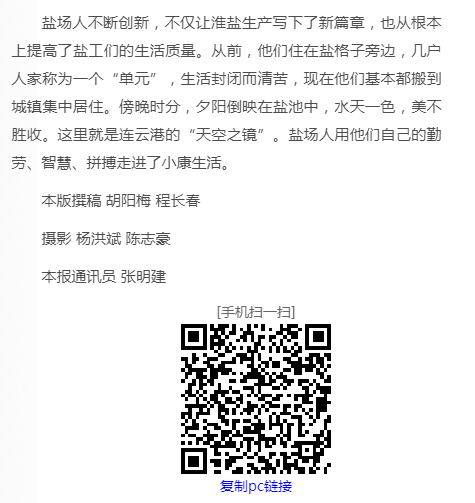 鹽場人不斷創(chuàng)新,不僅讓淮鹽生產(chǎn)寫下了新篇章,也從根本上提高了鹽工們的生活質(zhì)量。從前,他們住在鹽格子旁邊,幾戶人家稱為一個(gè)“單元”,生活封閉而清苦,現(xiàn)在他們基本都搬到城鎮(zhèn)集中居住。傍晚時(shí)分,夕陽倒映在鹽池中,水天一色,美不勝收。這里就是連云港的“天空之鏡”。鹽場人用他們自己的勤勞、智慧、拼搏走進(jìn)了小康生活。