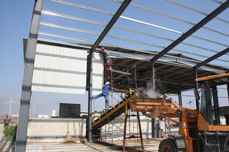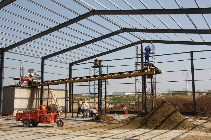 5月18日,位于北北歐農(nóng)莊生豬養(yǎng)殖廠旁邊的綠淮肥業(yè)公司有機(jī)肥生產(chǎn)基地,一個鋼結(jié)構(gòu)廠房即將完工,只見機(jī)聲轟鳴、焊花飛濺,機(jī)電服務(wù)公司的工人在勞模王緒華帶領(lǐng)下正在焊接鋼結(jié)構(gòu)件,而正在建設(shè)施工中的廠房內(nèi),兩條有機(jī)肥生產(chǎn)線運轉(zhuǎn)不停,沒有因廠房建設(shè)而停產(chǎn),廠房旁邊的一臺挖掘機(jī)正在整平場地,一邊建設(shè),不邊生產(chǎn),一派紅火景象。