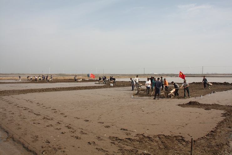 據(jù)了解,《淮鹽制作技藝》已于2015年成功申報國家級非物質(zhì)文化遺產(chǎn)保護項目并審核通過。此次央視攝制組主要圍繞淮鹽發(fā)展歷史來我公司拍攝平面灘、對口灘等制鹽工藝及過程,為制作淮鹽文化宣傳片收集影像資料。埒南制鹽分公司黨支部在接到通知后,高度重視此項工作,迅速組織黨員職工及有經(jīng)驗的班組長投入到灘地改造工作中來,為確保此次拍攝工作順利進行奠定了扎實的基礎(chǔ)。活動現(xiàn)場,大家按照事先劃分好的區(qū)域分工協(xié)作,互相配合,有鏟泥的,有利用獨輪車推泥的,不一會功夫就完成了四條池埝的制作。據(jù)“淮鹽文化傳承人”韓井軍介紹,下一步在平面灘制作完成后,再對格塊進行晾曬、“三嗆四壓”等工序后才能投入使用。(封楊)