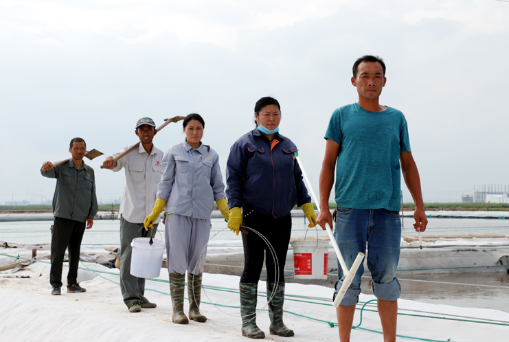 8月15日早,在制鹵區(qū)2班,班長王春好帶著班組的工人準(zhǔn)備干活,安排好每個(gè)人的工作后,大家拿起工具上灘,工人們分散開來,各自忙著手里的活。工人們前后排開,彎腰俯身,用鐵鍬挖溝做堰,為下雨排淡水做好準(zhǔn)備。“踩在鹵水里能感覺像是在“燙腳”,太陽把鹵水曬的滾燙的。”領(lǐng)灘手王春好用衣袖擦著臉上的汗水說,自己在灘上干了有七、八年了,對(duì)于這樣的工作環(huán)境已經(jīng)適應(yīng)了。進(jìn)入八月以來,連續(xù)7天最高溫度達(dá)到35以上,臺(tái)風(fēng)過后,今天的氣溫也達(dá)到了33度,令今年這個(gè)夏天,成為有完整氣象記錄最熱的夏天。跑水工仇海濱,到灘上一個(gè)多小時(shí),以是大汗淋漓,他帶領(lǐng)工人做一些修堰、補(bǔ)塑布、緊繩、還有查跑道頭的活。