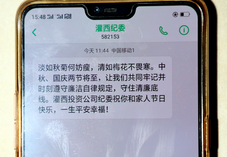 群發(fā)一條廉政提醒短信。以“灌西紀(jì)委”名義向全公司黨員干部普發(fā)“廉政短信”。向黨員領(lǐng)導(dǎo)發(fā)送廉政短信‘拉袖子 、敲警鐘’,以提醒黨員干部“嚴(yán)格執(zhí)行廉潔從政各項(xiàng)規(guī)定,‘反四風(fēng)’、樹新風(fēng),廉潔文明過佳節(jié)”,不僅提醒黨員干部做好廉潔帶頭人,更重要的是提醒廣大領(lǐng)導(dǎo)干部要牢記黨風(fēng)廉政建設(shè)兩個(gè)責(zé)任,在落實(shí)責(zé)任上要有主動擔(dān)當(dāng)!