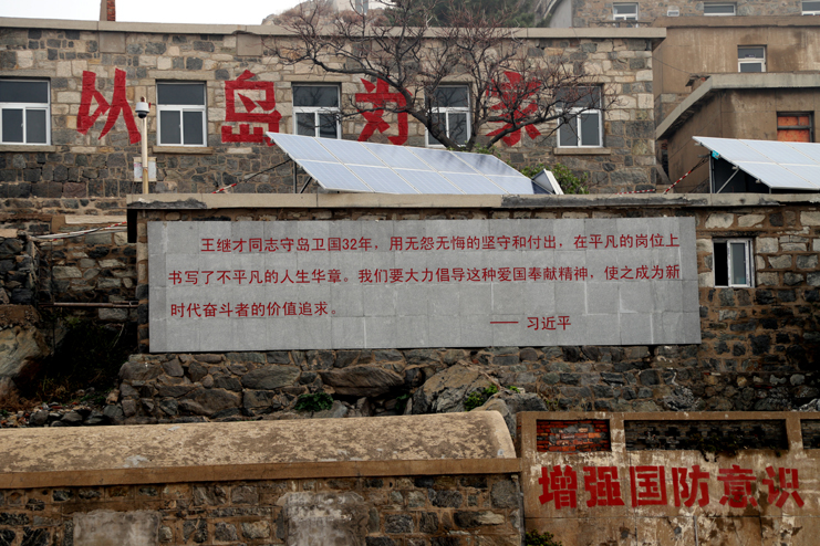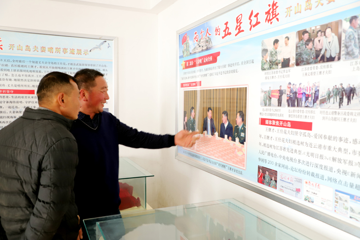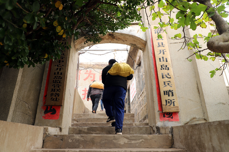 上午8點(diǎn),在發(fā)動(dòng)機(jī)巨大的轟鳴聲中,漁船緩緩駛離港口。近一個(gè)小時(shí)的顛簸,開山島出現(xiàn)在了視野里,由小到大,逐漸清晰。簡(jiǎn)易碼頭上,守島民兵遠(yuǎn)遠(yuǎn)地沖著大家揮手,船上的人顧不上漁船的劇烈晃動(dòng),一個(gè)個(gè)扒著船沿?zé)崆榛貞?yīng)著,所有人的臉上都寫滿敬意和期待。漁船隨著海浪的節(jié)拍上下晃動(dòng)著,班組長(zhǎng)們登上碼頭,就緊緊握住守島民兵的手,對(duì)他們守島衛(wèi)國(guó),無(wú)怨無(wú)悔堅(jiān)守和付出的愛國(guó)奉獻(xiàn)精神表示欽佩。班組長(zhǎng)們跟隨著守島民兵沿著王繼才夫婦他們當(dāng)年的巡邏路線,拾級(jí)而上,大家一邊感受巡島爬山的辛苦,一邊聆聽著守島民兵講解王繼才夫婦32年守島的艱難困苦和生離死別。