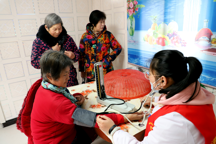 九點(diǎn)半,志愿者們來(lái)到中二圩社區(qū)新建點(diǎn)邱長(zhǎng)松家,邱老跟老伴正在揀黃豆芽,準(zhǔn)備中午的飯菜??吹街驹刚邆兊牡絹?lái),兩位老人熱情地迎出門(mén)來(lái),招呼我們進(jìn)屋,我們來(lái)到房間里,映入眼簾的是一張老式的八仙桌擺在室內(nèi)的一角,整個(gè)房間里擺設(shè)很簡(jiǎn)單,可以看出來(lái)老人的艱苦樸素、勤儉節(jié)約的生活作風(fēng)。志愿者和老兩口拉起家常,詢(xún)問(wèn)身體狀況和生活困難,并幫著大爺大媽揀黃豆芽。“我身體沒(méi)有什么大毛病,就是年歲大了,行動(dòng)不方便,小孩都不在身邊,要感謝志愿者來(lái)看我們老兩口”,邱大爺誠(chéng)懇的話(huà)語(yǔ)表達(dá)著心里的感謝。醫(yī)療志愿者為邱大爺跟老伴做了身體的簡(jiǎn)單檢查,這時(shí)從外面走來(lái)幾位剛買(mǎi)完菜路過(guò)的大嬸、大媽們,她們聽(tīng)說(shuō)有醫(yī)療志愿者在邱大爺家,也紛紛過(guò)來(lái)讓志愿者醫(yī)療隊(duì)的醫(yī)生查查身體,“我家就住在隔壁,聽(tīng)說(shuō)有志愿者醫(yī)療隊(duì)來(lái),我就想過(guò)來(lái)讓醫(yī)生幫我量量血壓,最近血壓或高或低的”,“剛在街上買(mǎi)菜回來(lái),路過(guò)這,看都穿灌西志愿者紅馬甲,我就進(jìn)來(lái)看看的,正好醫(yī)療隊(duì)在,我也給醫(yī)生查查看看。”大嬸、大媽們熱情的表達(dá)。